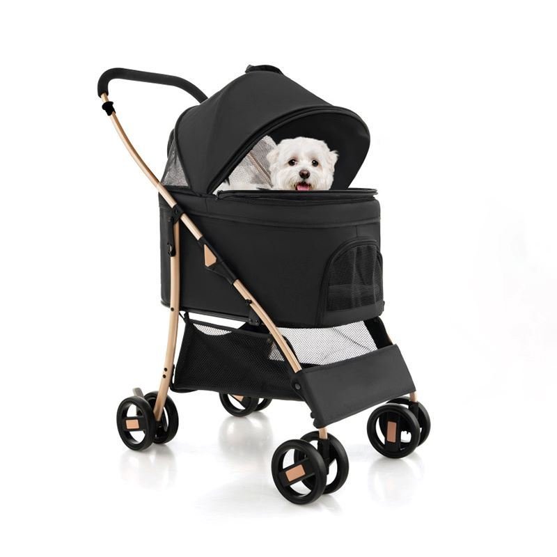 With a spacious interior, the pet stroller allows dogs to enjoy the ride.