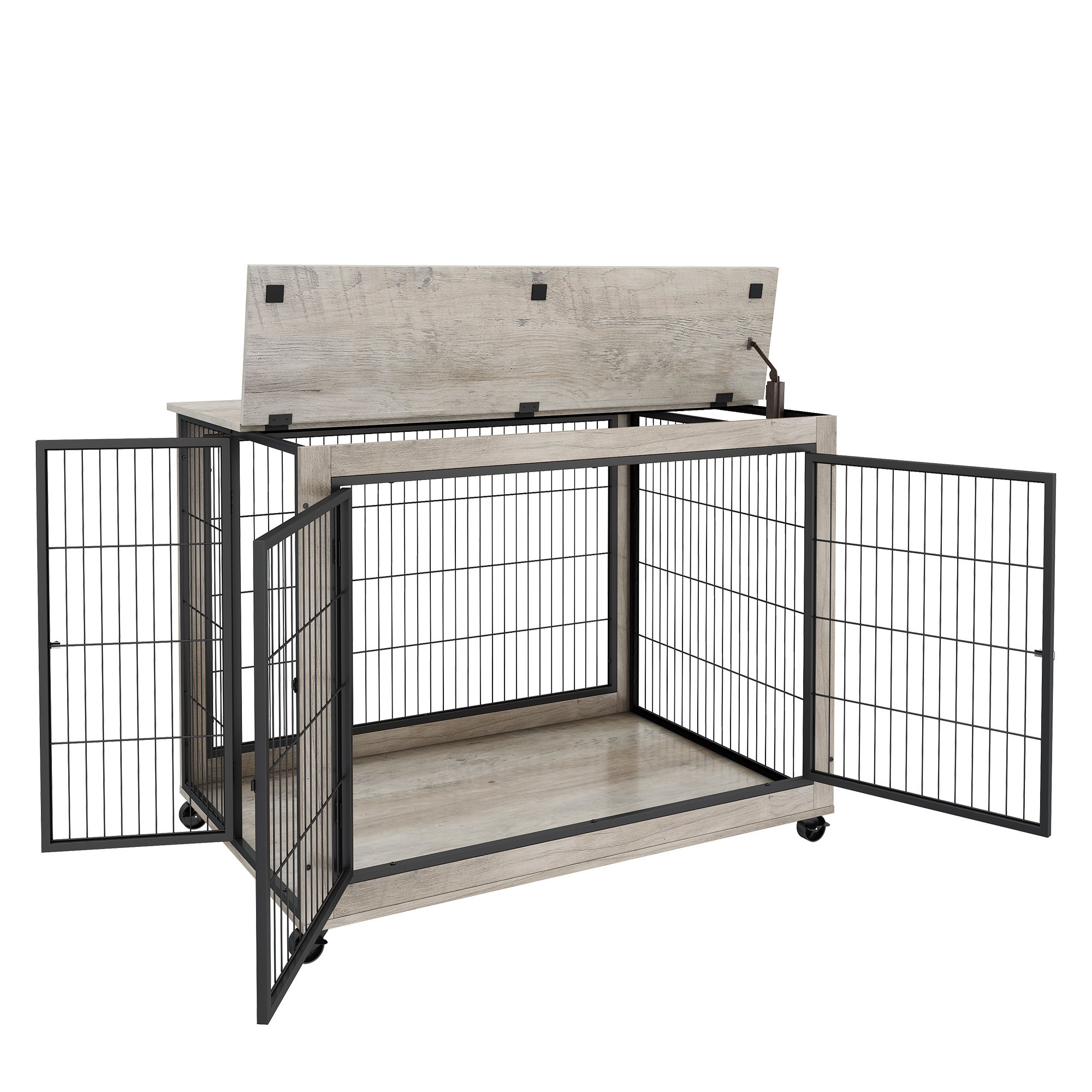 Furniture Style Dog Crate Side Table on Wheels with Double Doors and Lift Top. Grey, 43.7'' W x 30'' D x 31.1'' H.