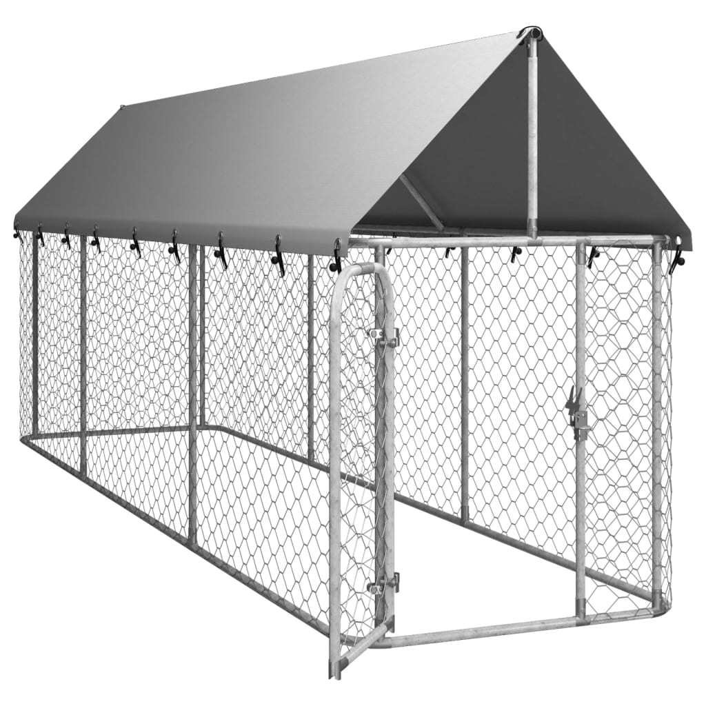 This large dog kennel provides ample exercise space while the mesh all around helps prevent mischief and unexpected accidents while enabling ventilation. Thanks to the sturdy and heavy-duty galvanized steel construction, this quality dog kennel is durable and built to last. Made of 100% polyethylene, the included top canopy is fire-resistant and UV protected, providing protection from sun, rain, snow, as well as other weather conditions. The hinged door with lockable latch system ensures extra security and safety for your dogs.Color: SilverMaterial: Galvanized steel, fabric (100% polyethylene)Overall dimensions: 157.5" x 39.4" x 59.1" (L x W x H)Gate size: 17.7" x 35.8" (W x H)With a roofLockable latch systemAssembly required: Yes
